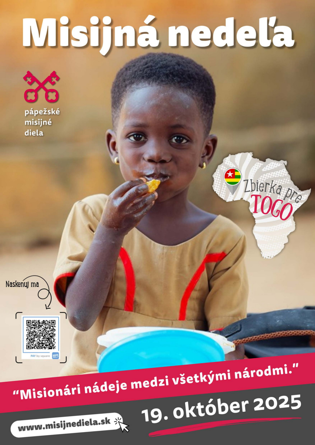 S poverením pápeža Leva XIV. sa Cirkev na celom svete modlí a zbiera milodary na Misijnú nedeľu, ktorá tento rok pripadá na 19. október 2025. Misijná nedeľa je najväčšou solidárnou akciou na svete. V túto nedeľu spoločne vyjadrujeme solidaritu s tými, ktorí našu pomoc najviac potrebujú. Pomôžte, prosím, aj vy – spoločne pre najchudobnejších!