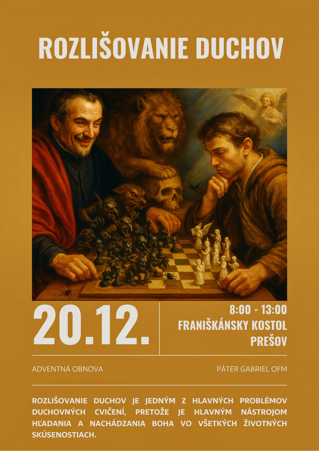 Srdečne vás pozývame na adventnú obnovu – Rozlišovanie duchov, ktorá sa uskutoční 20. decembra od 8:00 do 13:00 vo Františkánskom kostole v Prešove.